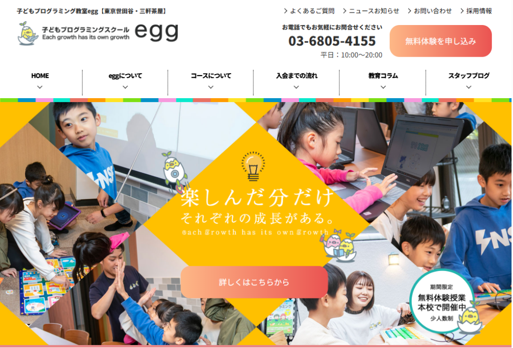 | egg | 小学生〜高校生中心 | 楽しさ・創造力重視の体験型学習 | △(基礎づくり中心) | 講師・メンターの見守り型サポート | 初めてITに触れる学生/楽しく学ばせたい保護者 |