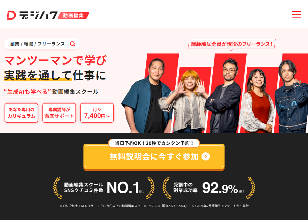 デジハクは、動画編集を中心としたデジタルスキルを、オンラインで効率よく学びたい人向けのスクールです。特に、副業・在宅ワーク・フリーランスといった柔軟な働き方を視野に入れている人にとって、学習スタイルと目的が一致しやすい点が大きな魅力です。
