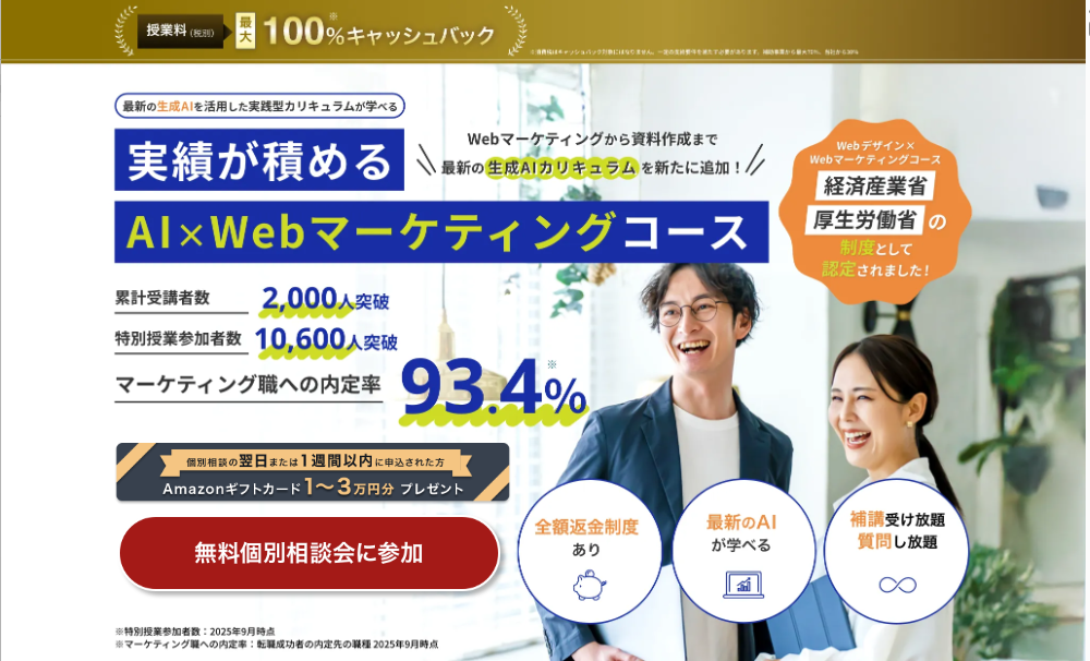 特に、Web業界やマーケティング職への転職、副業としての案件獲得を目指す人に向けて、「知識だけで終わらせない」学習設計が意識されています。未経験からでも取り組める一方で、ビジネス視点を求められる場面が多く、クリエイティブと数字の両方に興味がある人に向いたスクールです。