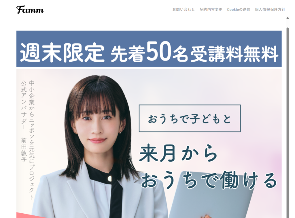 ファムは、女性向け・在宅ワーク志向に特化したオンラインスクールとして設計されている点が大きな特徴です。特に、主婦や子育て中のママ、ブランクのある女性など、「時間や働き方に制約がある層」を主な対象としています。
