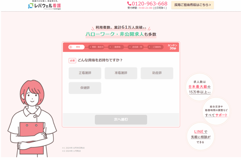 レバウェル看護は、業界最大級の求人数と手厚いサポートで看護師から圧倒的な支持を集める転職サイトです。