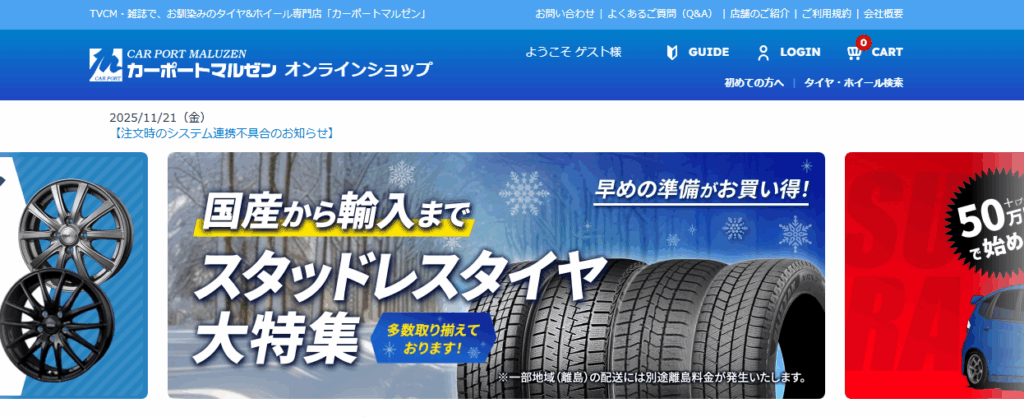 カーポートマルゼンは、ホイールとセットでのタイヤ購入に強みを持つ大手タイヤ通販サービスです。ネット上でタイヤやホイールを選び、購入すると提携の取付店舗へ配送され、手間なく交換が可能です。取扱メーカーは幅広く、デザイン性の高いホイールセットが豊富なため、車の見た目にこだわるユーザーから支持されています。一方で、ブリヂストンのような“メーカー公式の品質保証付き交換”とは異なり、作業品質は店舗ごとにばらつきがあります。また、ファミリーカー向けの安全性重視というよりは、カスタム需要やデザイン重視のユーザーに適している点が特徴です。ネット完結で便利ではあるものの、ファミリー向けとしてはやや優先度が下がります。