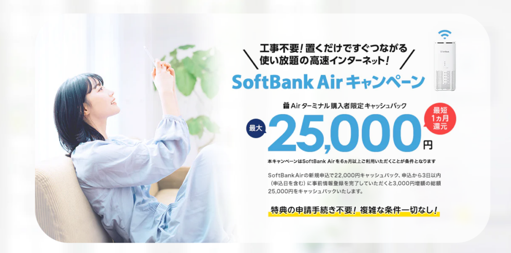 | 1位 | SoftBank Air | 5,368円(税込) | 3,300円 | ソフトバンク(4G/5G) | 不要 | キャッシュバック/月額割引あり | 総合力No.1。安定性・実績・セット割で失敗しにくい |
