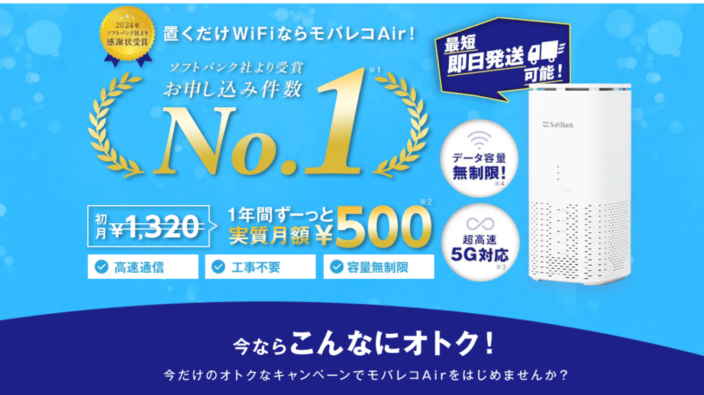 モバレコAirは、SoftBank Airの回線・端末を利用した正規代理店サービスで、特にキャンペーン重視で初期費用を抑えたい人に選ばれている工事不要WiFiです。利用する回線自体はSoftBank Airと同じため、工事不要で端末が届けばコンセントに挿すだけですぐにインターネットが使える手軽さは変わりません。賃貸物件や工事不可の環境でも導入しやすく、引っ越し直後のネット確保にも向いています。