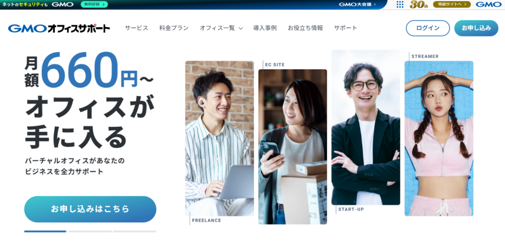GMOオフィスサポートは、インターネット事業で高い知名度を誇るGMOグループが運営するバーチャルオフィスサービスです。運営母体が大手企業という安心感が最大の特徴で、法人登記対応・郵便物受取など、バーチャルオフィスに求められる基本機能をしっかり備えています。
