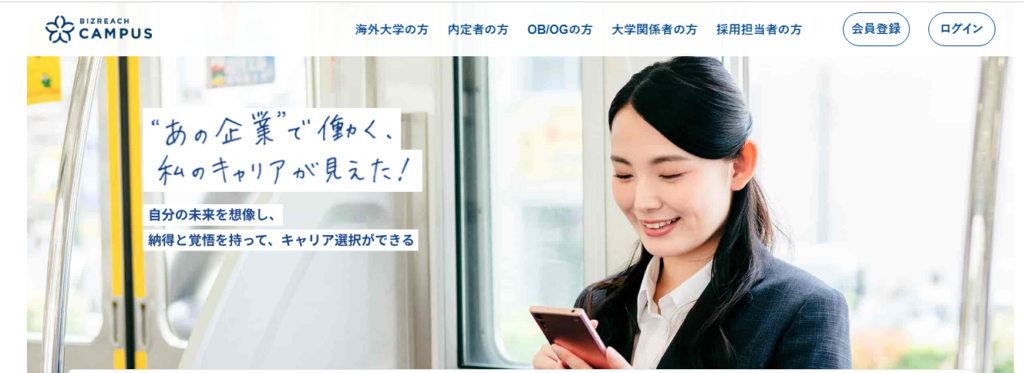 ビズリーチ・キャンパスは、学生が「自分の大学の先輩(OB/OG・内定者)」にアクセスし、企業理解を一気に深められる就活サービスです。大学別にサービスが提供されているため、同じ大学という共通点から先輩を探しやすく、OB/OG訪問を通じて仕事内容・社風・選考のリアルを短時間で吸収できます。ビズリーチ・キャンパス