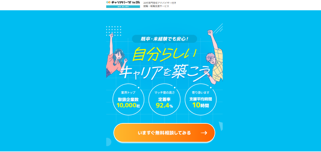 「就活が怖い」「何がダメかわからない」という状態から抜け出すには、第三者の視点で“改善点を言語化”してもらうのが一番早いです。キャリアパーク就職エージェント For20’sは、求人紹介だけでなく対策まで含めて無料で支援してくれるのが魅力。特に既卒・第二新卒・未経験寄りで、ひとりで戦うのがしんどい人は、まず無料相談で課題を棚卸しすると次の一手が見えます。
