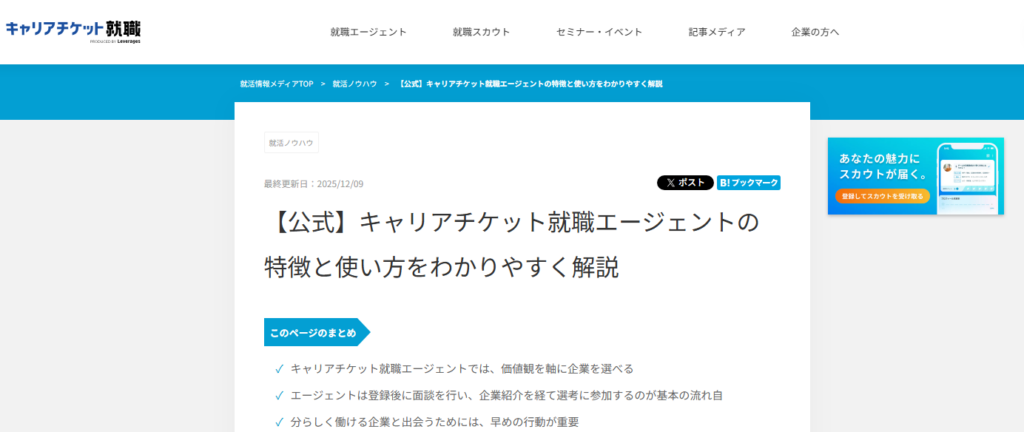 キャリアチケット就職エージェントは、「価値観を軸に企業を選べる」ことを打ち出し、専任アドバイザーの伴走(エージェント)と、プロフィールを見た企業からオファーが届く(スカウト)を組み合わせて就活を進められると説明されています。キャリアチケット就職